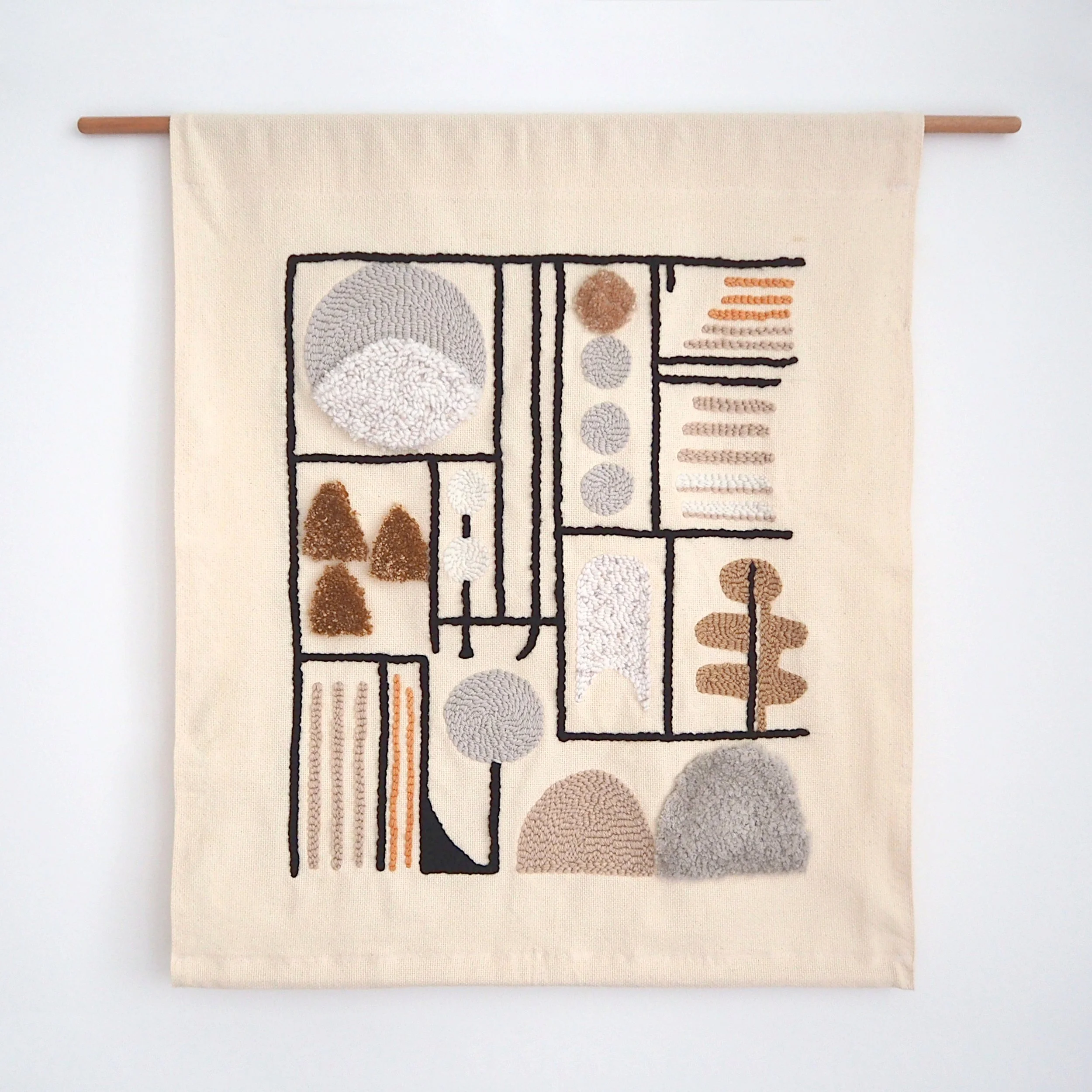 All Stephanie’s punch-needle artworks are created using an open-weave base fabric and yarns in an assortment of colours, textures and materials. Large scale tapestries can be a striking and timeless wall-art format for your space, while being easy to hang and transport. Small and medium scale artworks can be either hung as tapestries or displayed stretched over a frame.
