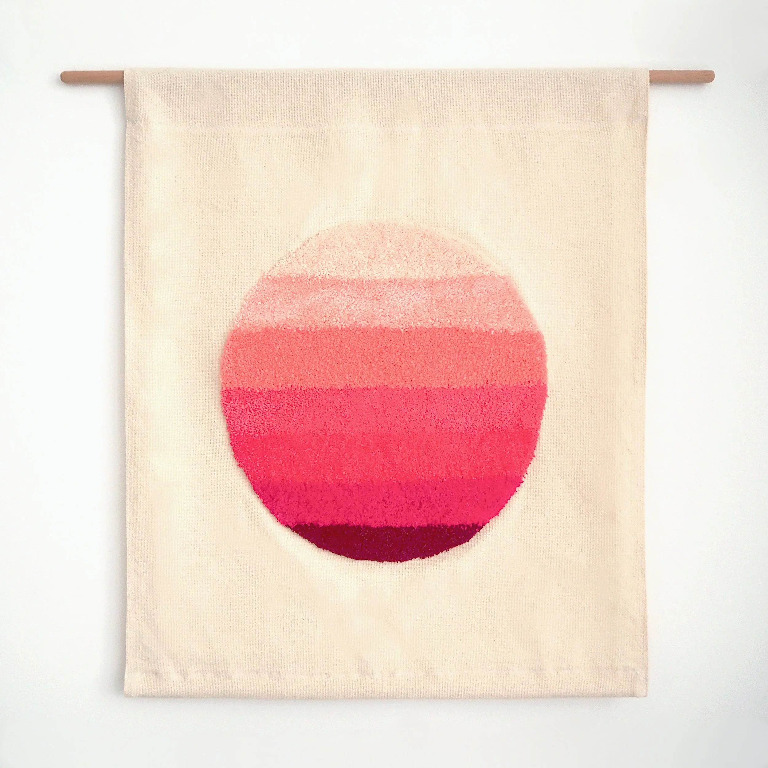 This large punch needle tapestry measures approximately 60x80cm and is made with assorted yarns in various shades of pink and a cotton-blend tufting fabric. It includes a wooden upper dowel for mounting and an inner bottom dowel for stability.