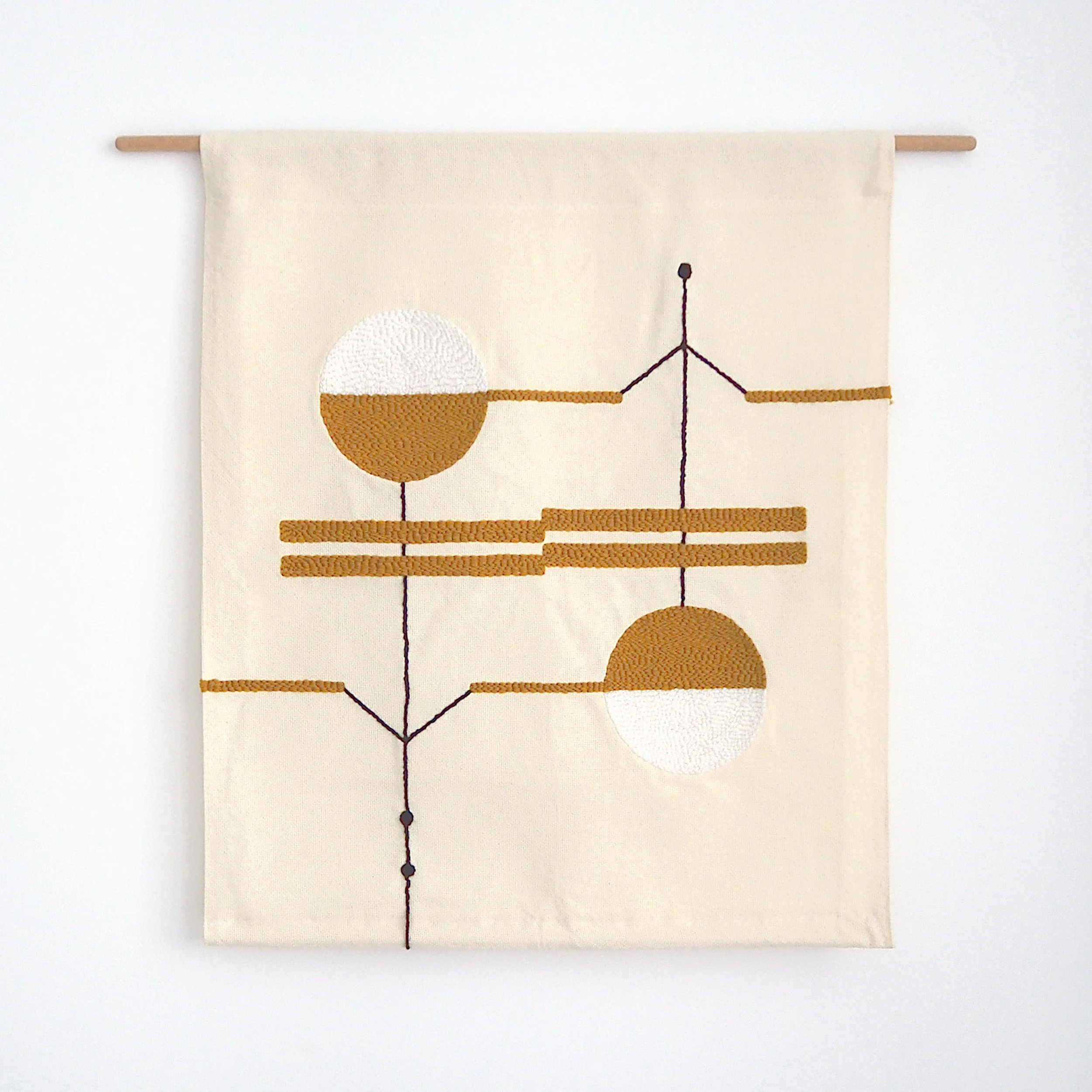 This punch-needle tapestry is a one-of-a-kind artwork, measuring approximately 60x80cm. It is made with yarn and a cotton-blend fabric and comes with an upper wooden dowel for mounting and an inner bottom dowel for stability.