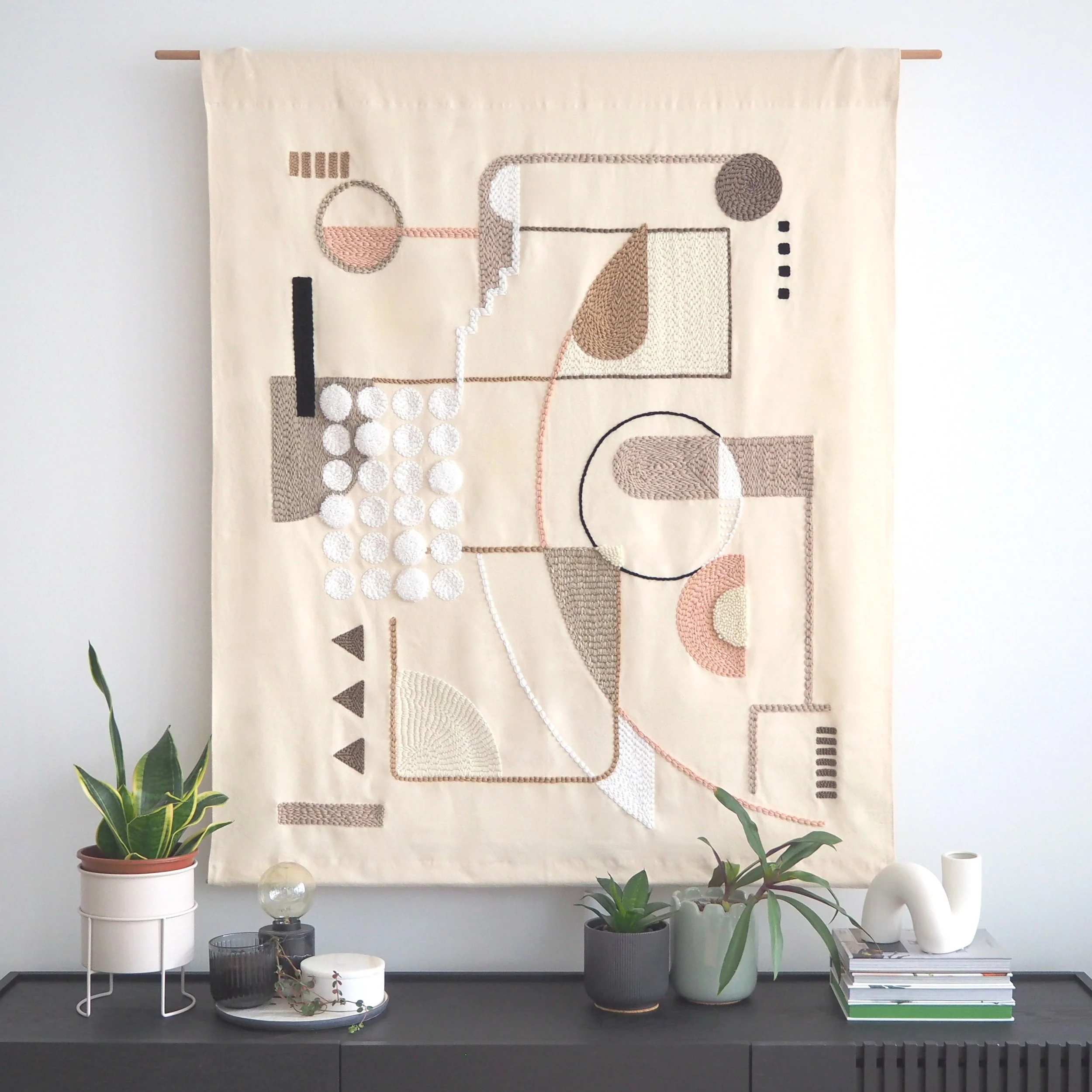 This extra large-scale punch needle tapestry measures approximately 120x140cm and is made using assorted yarn and a cotton-blend tufting fabric. It includes a wooden upper dowel for mounting and an inner bottom dowel for stability.
